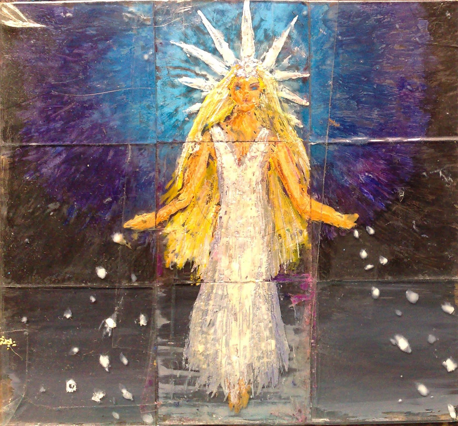 I've made this drawing last week starting from a painting I've made by the year 2000, a painting of a winter queen with long blond hair wearing a snow white dress, with a bue light aura around her.